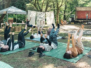 モリノネカワノネは緑がいっぱい!草の上にごろんと寝転がって、大地と青空を感じませんか。誰でもできるやさしいヨガで、心身ともにリフレッシュしましょう。