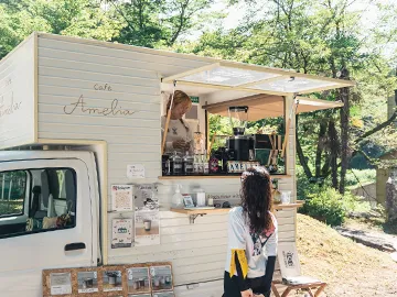 森のなかにキッチンカーがやってくる!出来立てのフードやドリンクをお楽しみください。