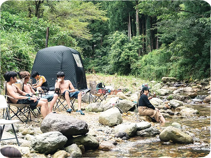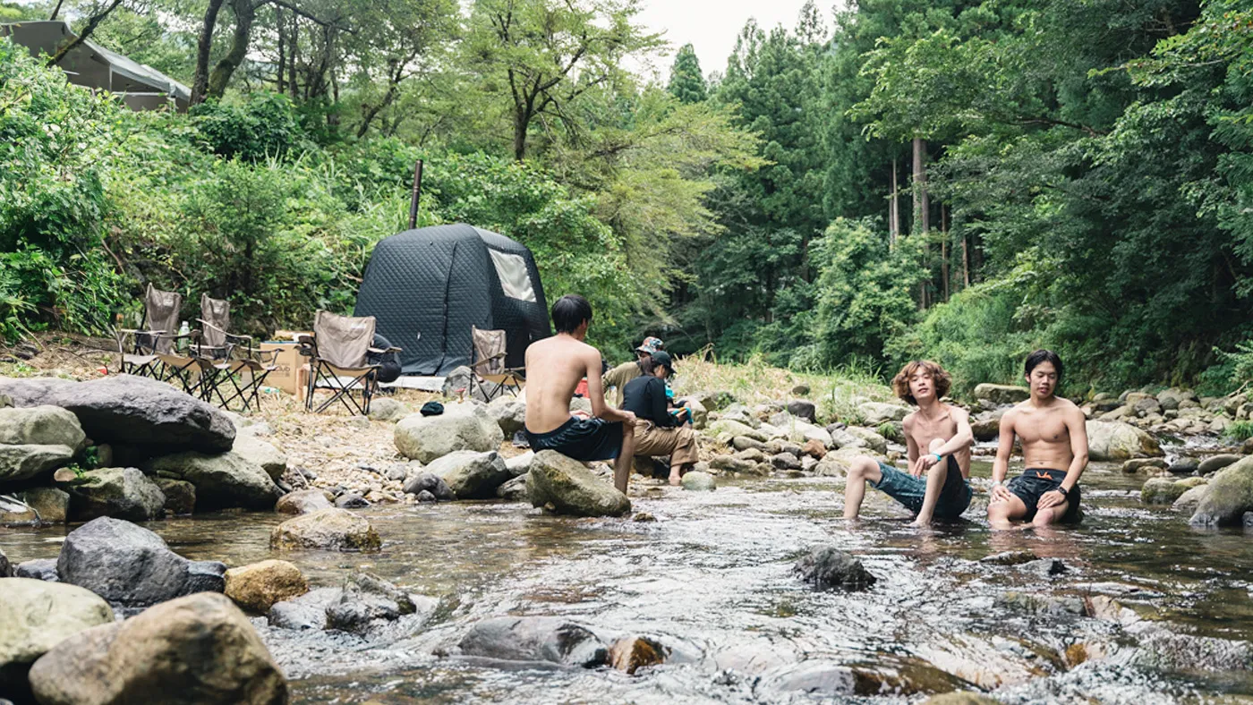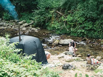 モリノネカワノネの川辺にテントサウナが登場。しっかり身体をあたためたら、そのまま川へダイブ!自然のなかでととのう体験をお楽しみください。