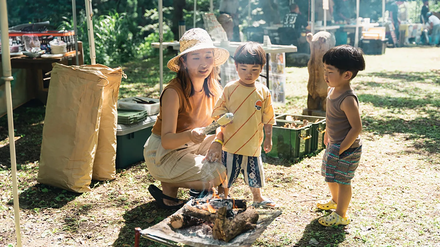 道具の提供:村の鍛冶屋 / 藤田金属焚き火をつかって、自由にクッキング!マルシェエリアで購入した食材をその場でお楽しみいただけます。アウトドアにおすすめな調理器具の貸し出しも。